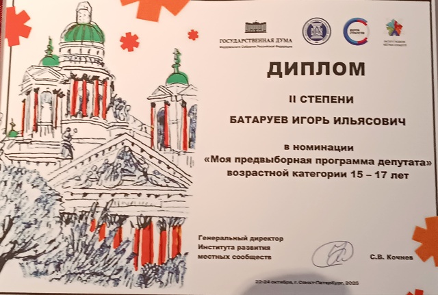 Диплом II степени в номинации «Моя предвыборная кампания депутата» получил воспитанник отряда «Флотилия «Ковчег»» уральского отряда Братства Православных Следопытов Игорь Батаруев на VI Всероссийском конкурсе «Молодые стратеги России».