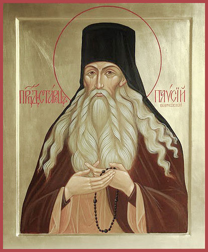 Странен быв на земли,/ Небеснаго Отечества достигл еси/ преподобне отче Паисие,/ добротолюбия подвижниче,/ верных научил ум к Богу возводити/ и сердцем к Нему взывати:/ Господи Иисусе Христе, Сыне Божий,/ помилуй мя, грешнаго.