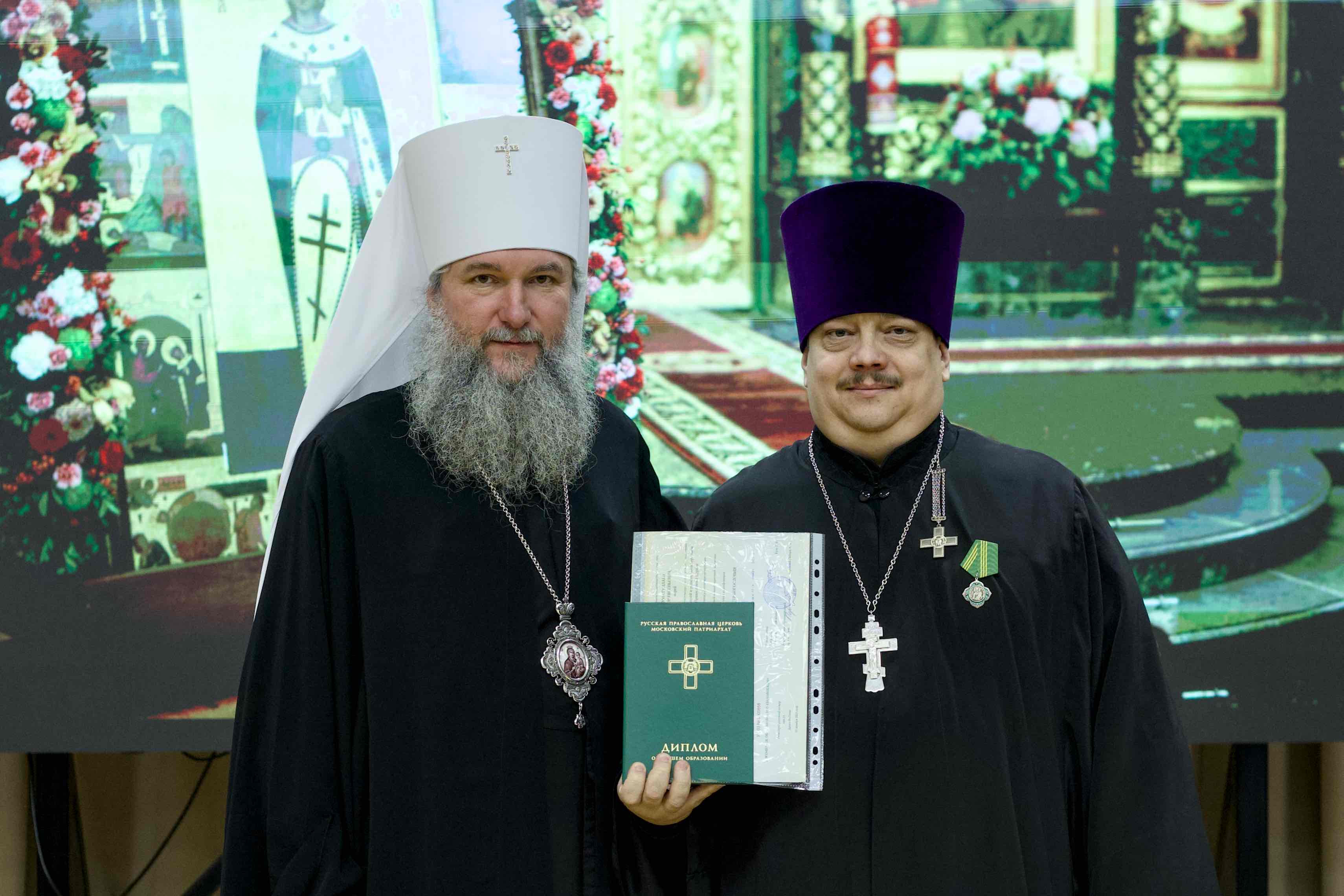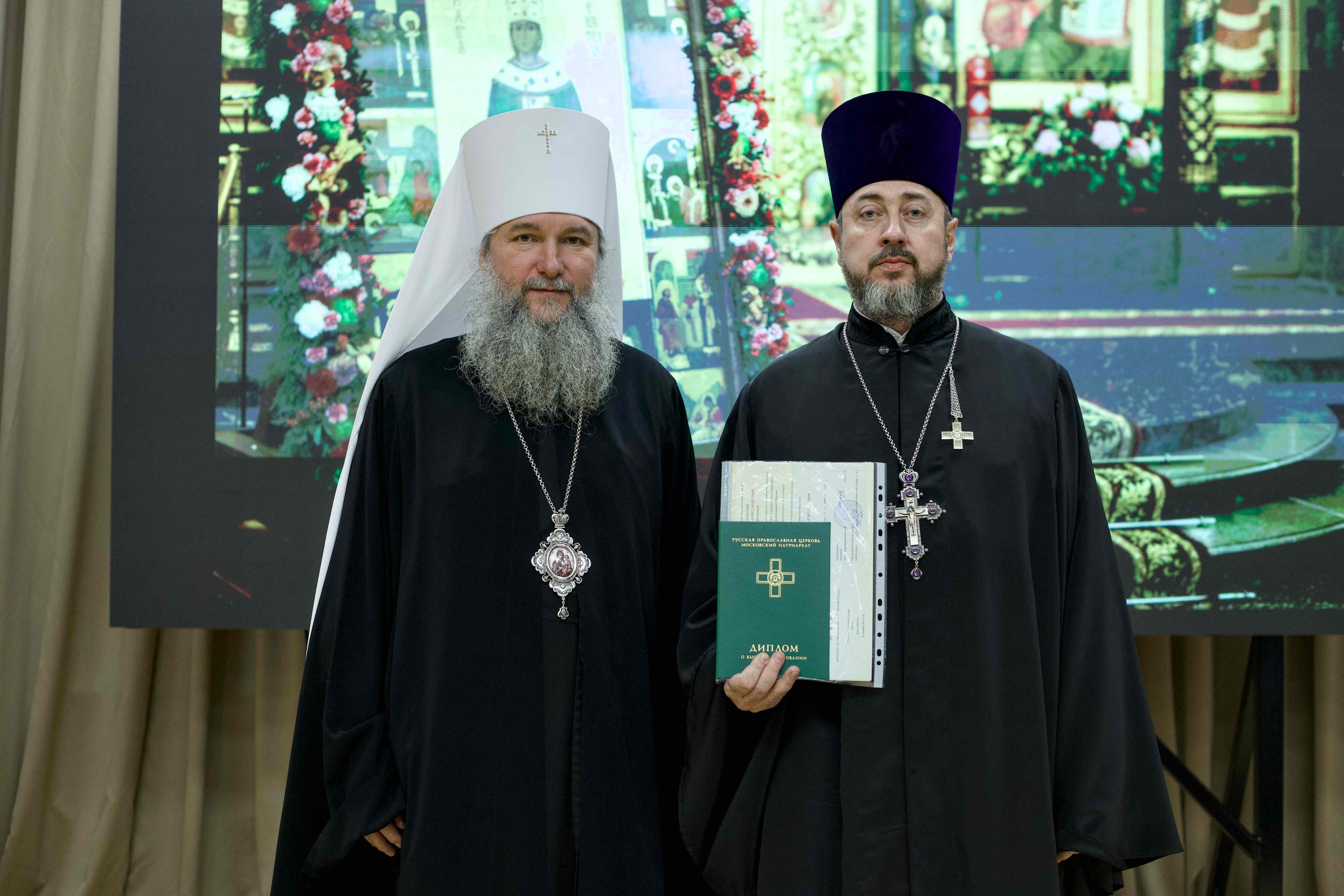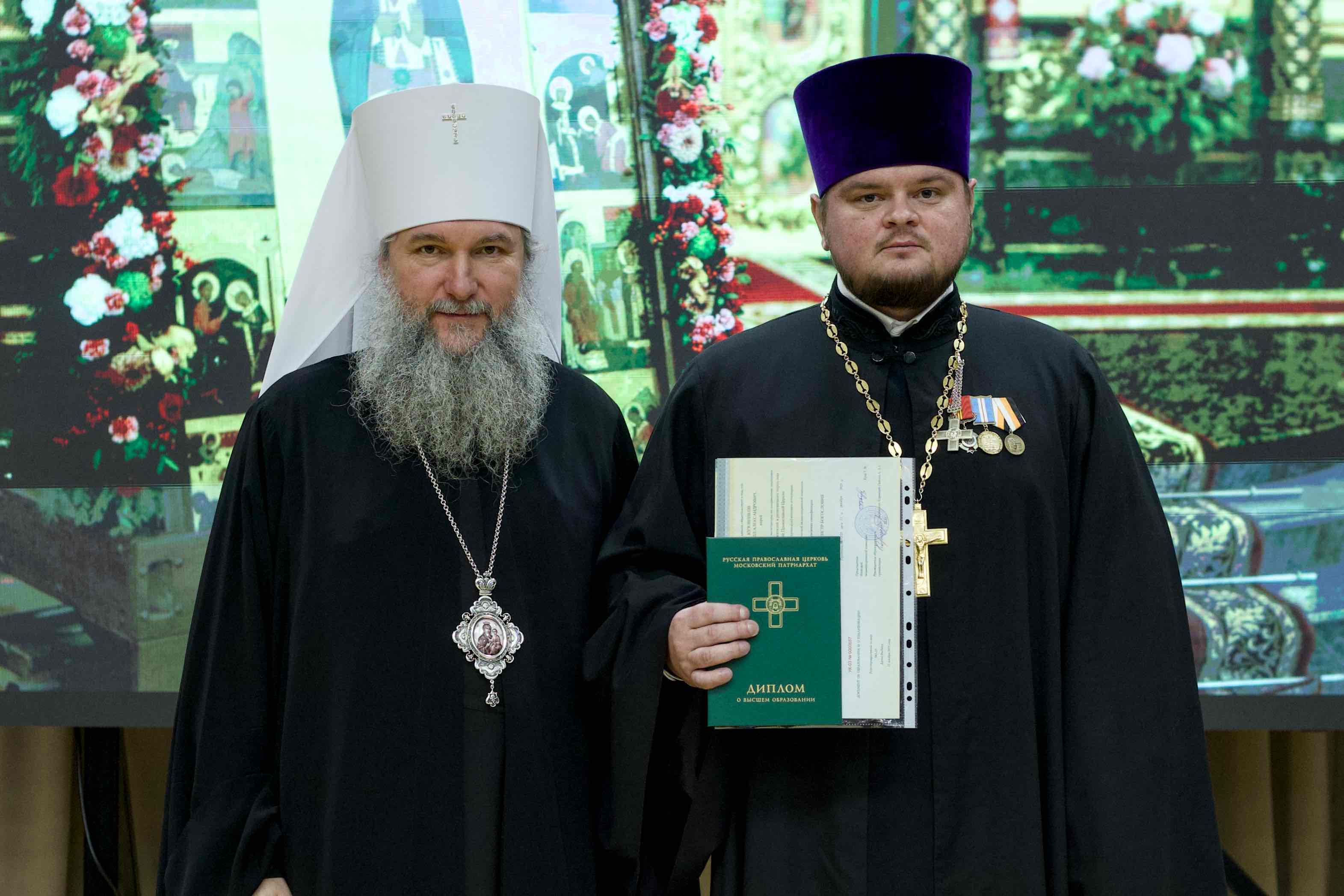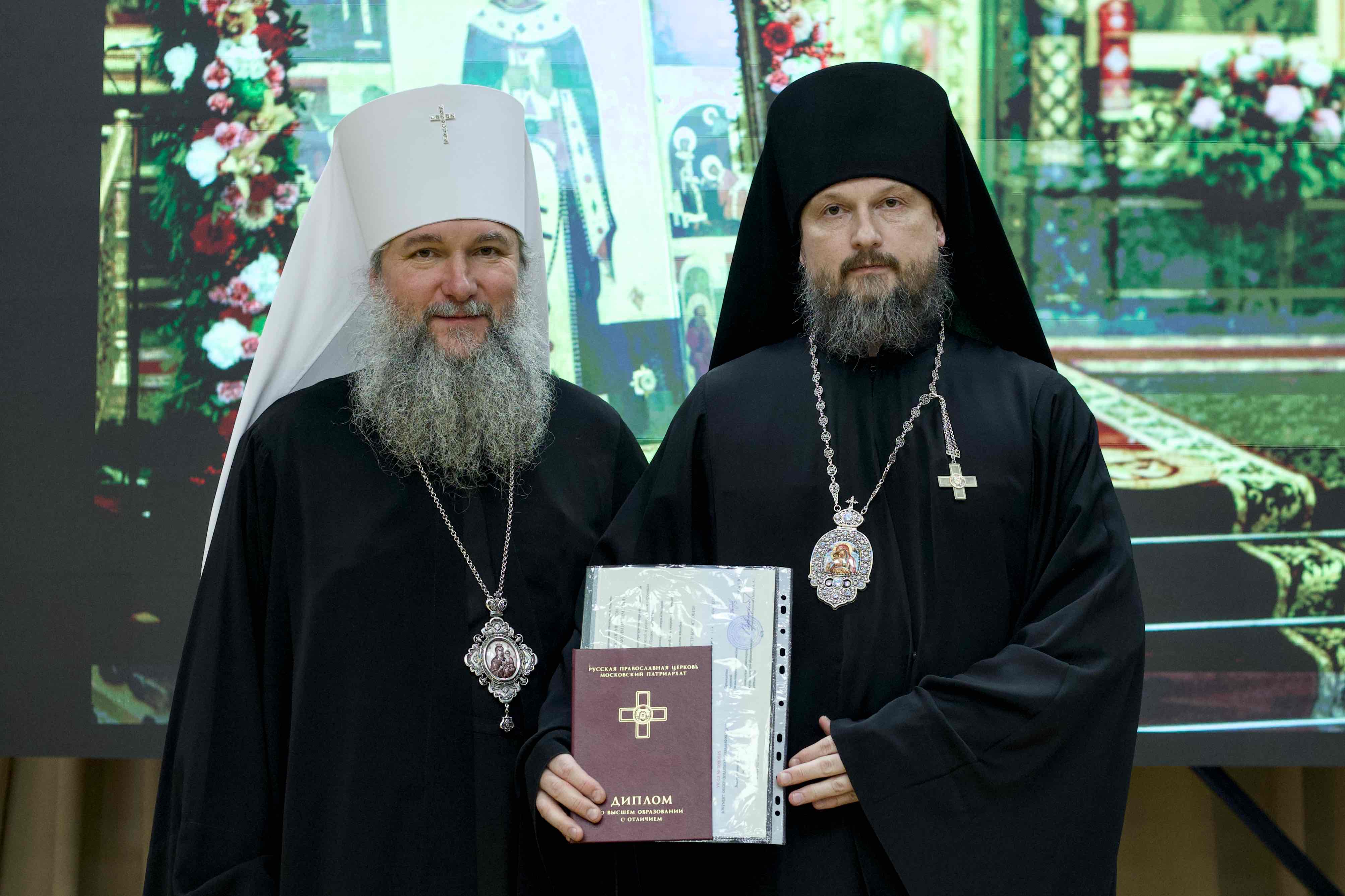 В завершение ежегодного епархиального собрания митрополит Евгений вручил дипломы об окончании магистратуры Екатеринбургской Духовной семинарии выпускникам этого года – епископу Нижнетагильскому и Невьянскому Мелитону, протоиерею Николаю Тарантину, иерею Кириллу Кузовникову, иерею Феодору Рахматуллаеву, иеромонаху Иоанну (Шиплонику), иерею Вадиму Шуманову.