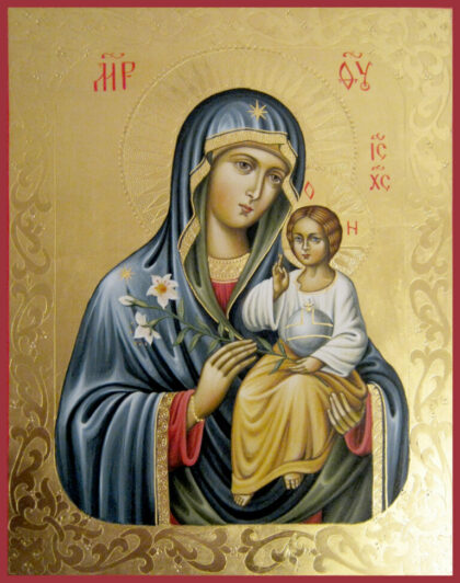 На иконе Пресвятая Богородица держит Своего Божественного Сына на правой руке, а в левой руке у Нее — цветок белой лилии. Этот цветок символически знаменует неувядаемый цвет девства и непорочности Пречистой Девы, к Которой так и обращается Святая Церковь: «Ты еси Корень девства и Неувядаемый Цвет чистоты».